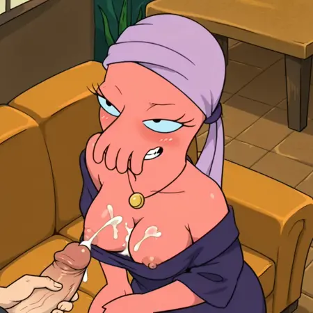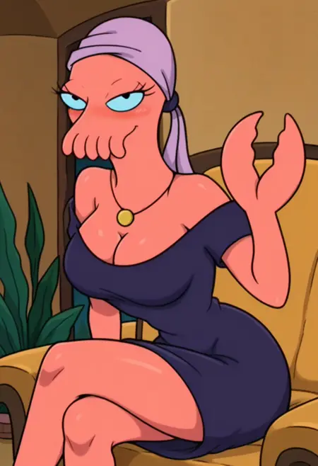 alien female, pink skin, blue sclera, black eyes, mouth flaps, pincer hands