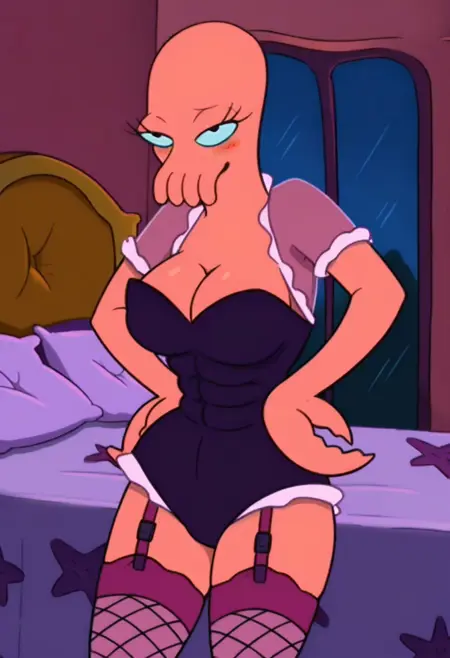 bald, see-through gown, purple corset, fishnet thighhighs, garter straps