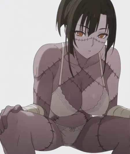 长发,棕色头发,黑发,黄眼睛,棕色眼睛,橙色眼睛,疤痕,高马尾,马尾,彩色皮肤,多色皮肤,缝线,灰色皮肤,僵尸,拼接皮肤,短发,刘海,