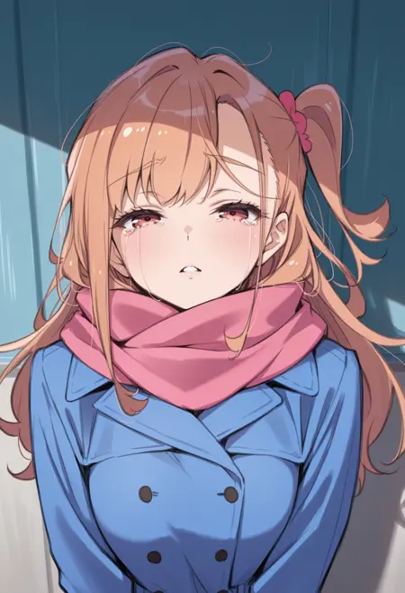 蓝色外套,粉色围巾