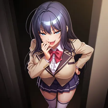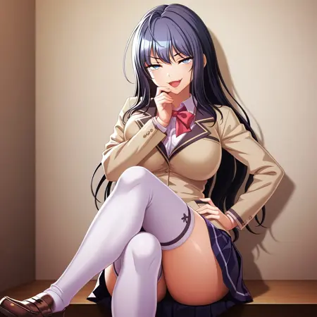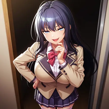 학교 유니폼: miho_uniform, 1girl, 긴 머리, 어두운 파란 머리, 파란 눈, 학교 유니폼, 흰색 셔츠, 베이지색 블레이저, 흰색 티그하이스, 큰 가슴, 긴 소매, 빨간 리본 넥타이, 파란 스커트,