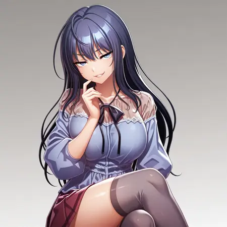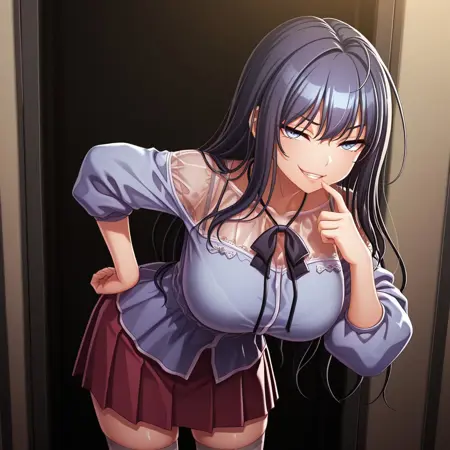 캐주얼: miho_casual, 1girl, 긴 머리, 어두운 파란 머리, 파란 눈, 회색 티그하이스, 큰 가슴, 파란 셔츠, 투명, 빨간 스커트, 짧은 스커트, 검은 리본 넥타이,