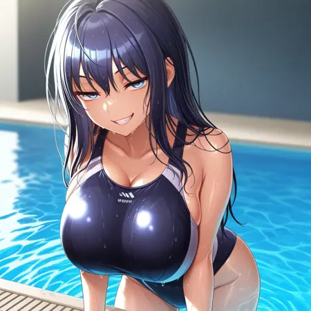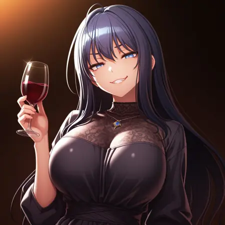 캐릭터: 1girl, 긴 머리, 어두운 파란 머리, 파란 눈, 큰 가슴,