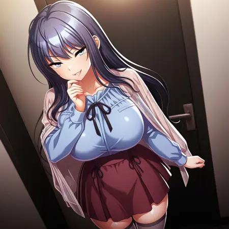 Casual: miho_casual, 1girl, long hair, dark blue hair, blue eyes, grey tighhighs, big breasts, blue shirt, see through, red skirt, short skirt, black ribbon tie,