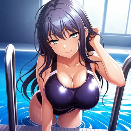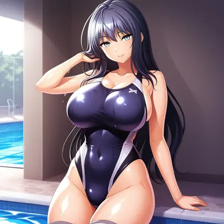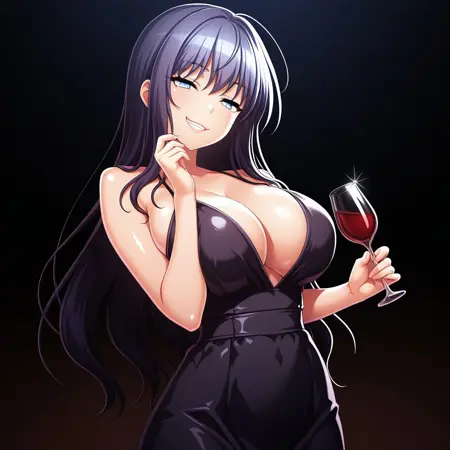 Character: 1girl, long hair, dark blue hair, blue eyes, big breasts,