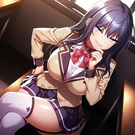 School uniform: miho_uniform, 1girl, long hair, dark blue hair, blue eyes, school uniform, white shirt, beige blazer, white tighhighs, big breasts, long sleeves, red bow tie, blue skirt,