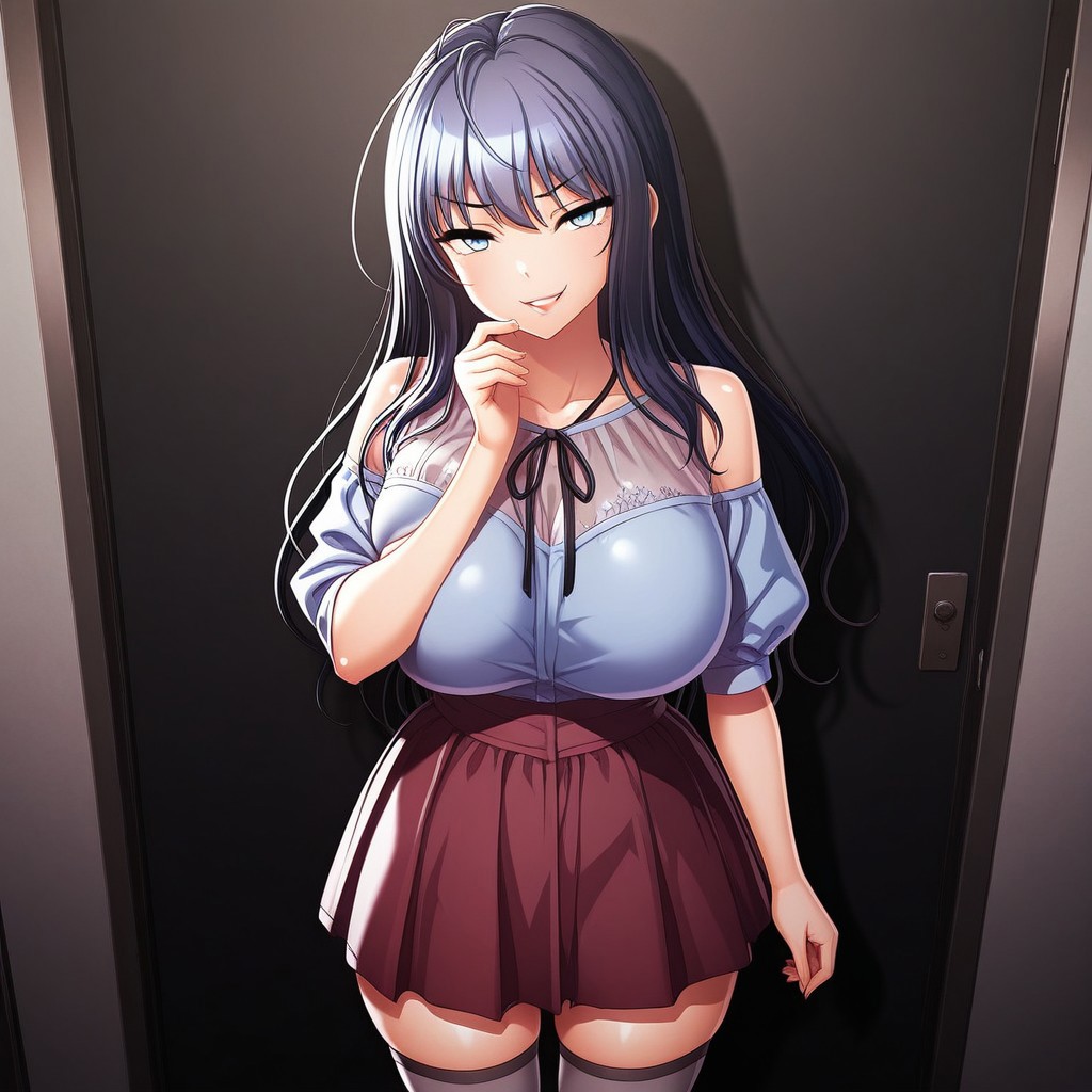 休闲装:miho_casual,1个女孩,长发,深蓝色头发,蓝眼睛,灰色过膝袜,大乳房,蓝色上衣,透视效果,红色裙子,短裙,黑色丝带领结