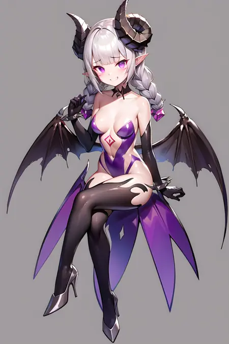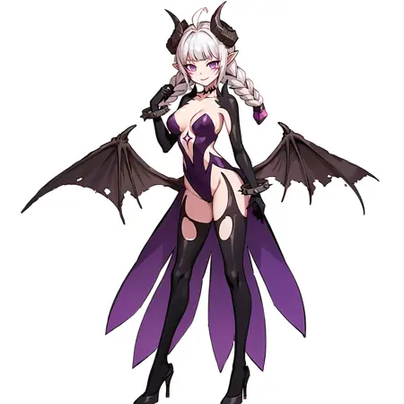 가중치 0.6-0.8 권장 해상도: 768*768 트리거 키워드: Nyarly, 날카로운 귀, 악마 소녀, 두 개의 땋은 머리, 하이힐, 보라색 눈, 검은 허벅지 양말, 악마 날개, 악마 뿔, 보라색 레오타드, 채찍 추가 가능: whip