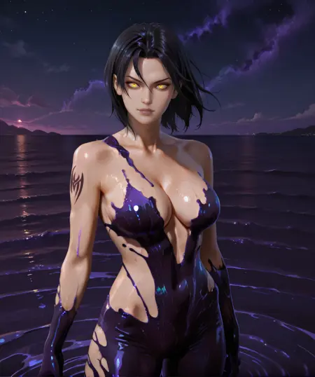 slimy tights, or purple slimy attire, or purple slimy bodysuit, or purple leotard, slimy gloves, cleavage,