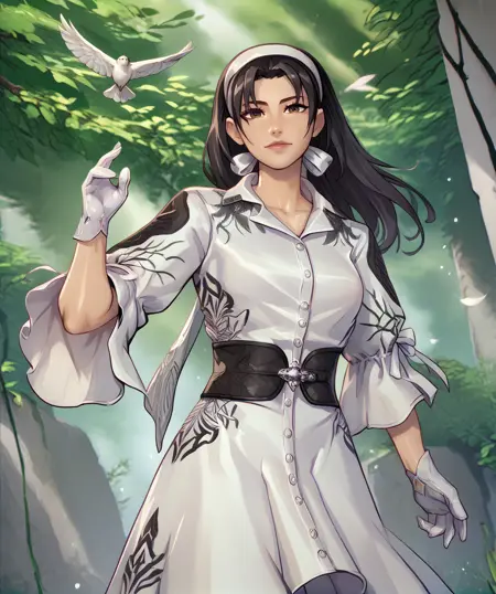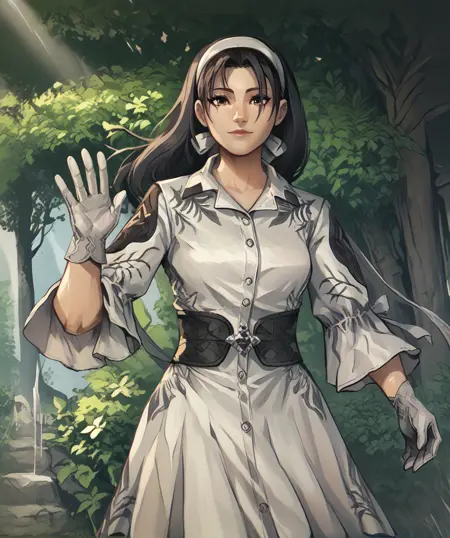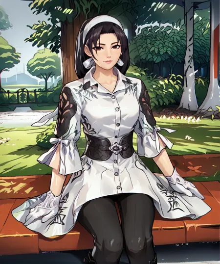 发带或头带,白色上衣、白色衬衫或白色长袍,裙子,短袖、宽袖,白色手套,黑色裤子