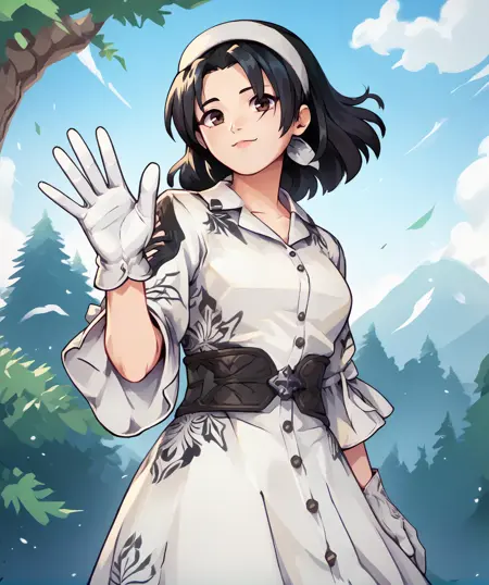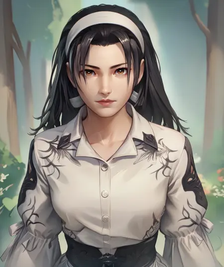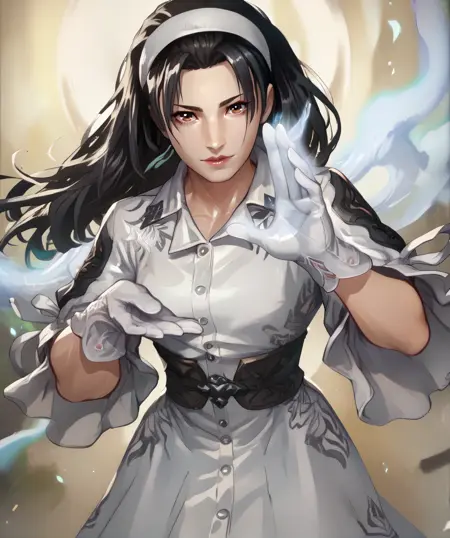 hairband, or headband, - white top, or white shirt, or white robe, skirt, - short sleeves, wide sleeves, white gloves, black pants, or black pants,