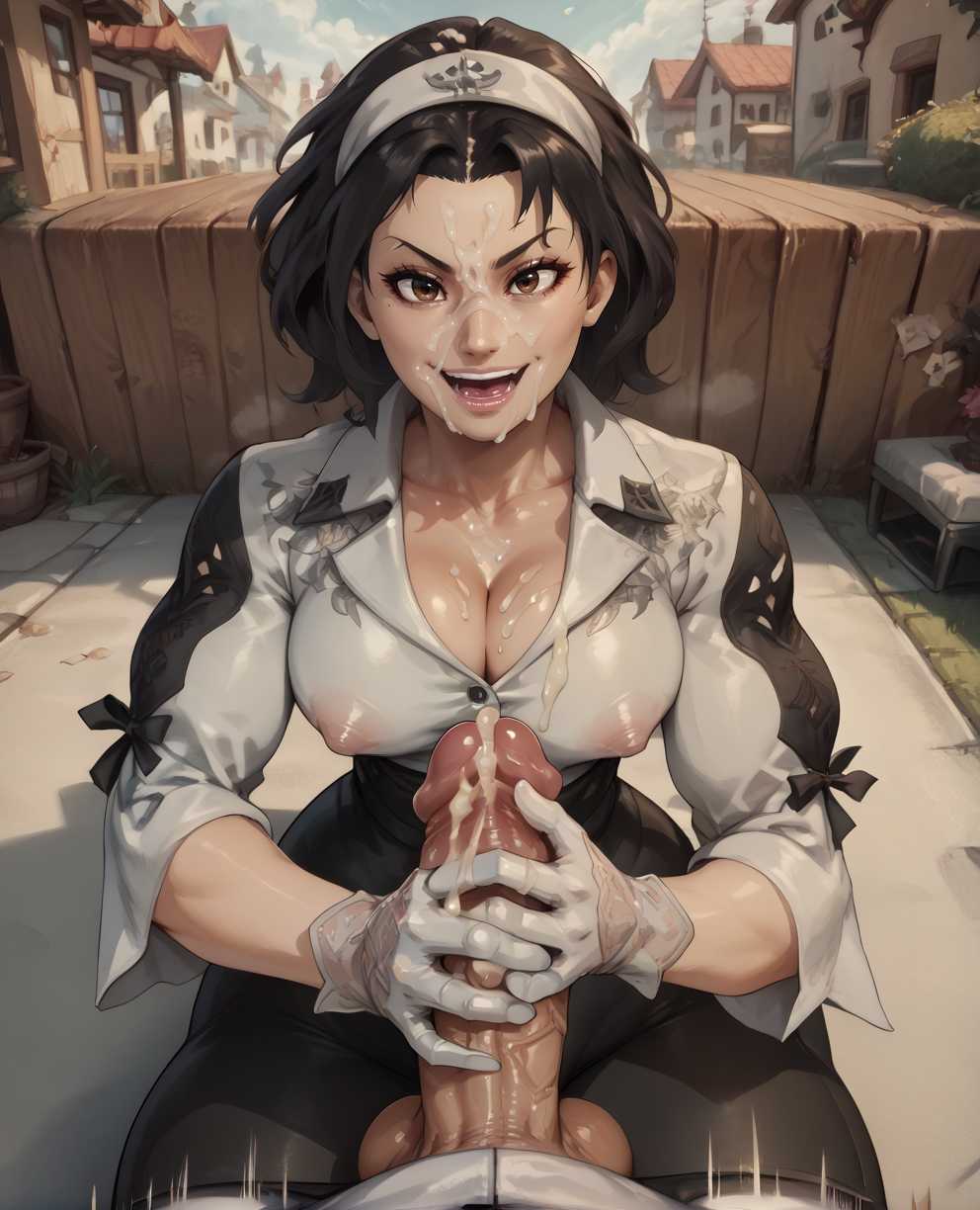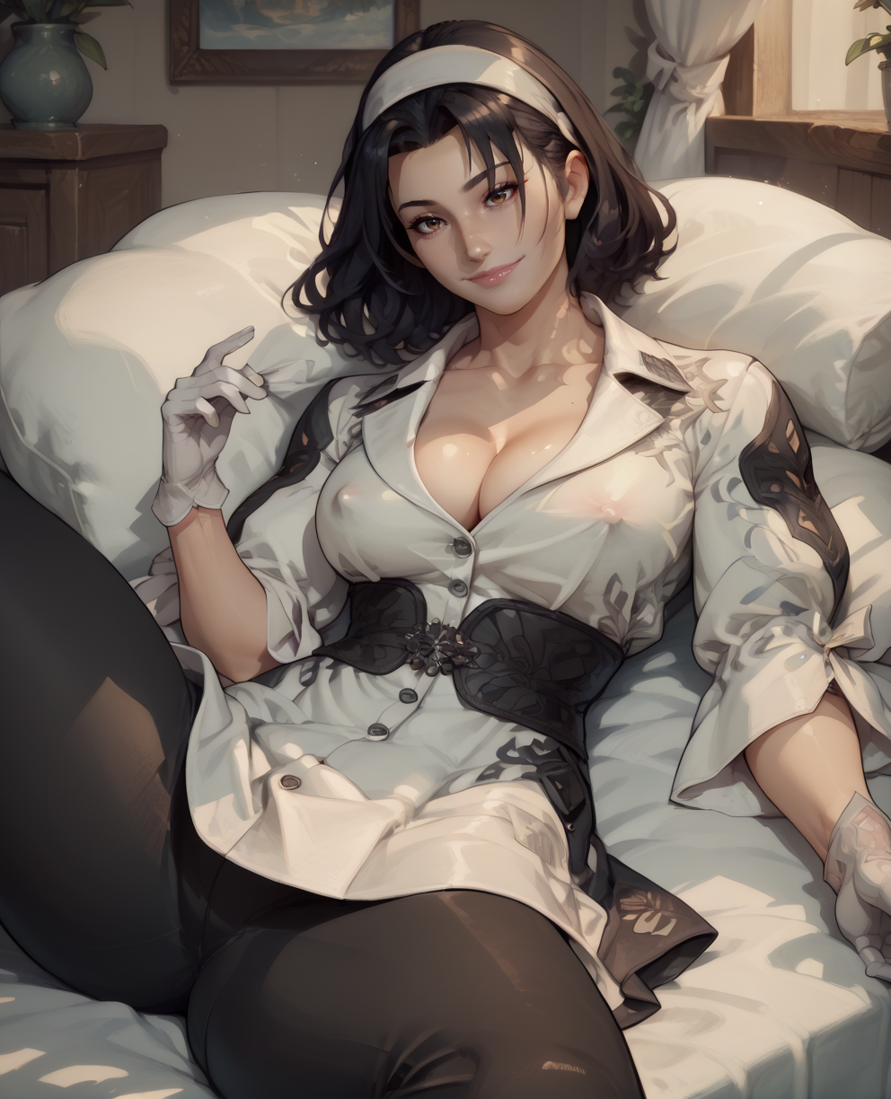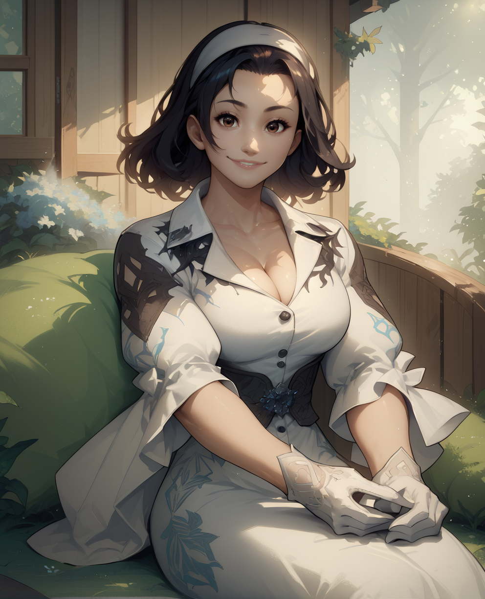 hairband, or headband, - white top, or white shirt, or white robe, skirt, - short sleeves, wide sleeves, white gloves, black pants, or black pants,
