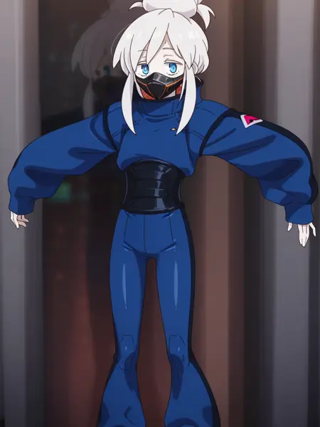 Gundam_GQuuuuuuX_Deux_Murasame, 1girl, solo, white hair, blue eyes, single hair bun, mouth mask, blue jacket, long sleeves, freckles