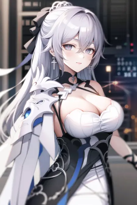bronya zaychik, red pupils, breasts, long hair, grey hair, bangs, grey eyes, earrings, drill hair, twin drills, hair between eyes, large breasts, hair ornament, [Explain in detail what clouthes you would like to trigger......]