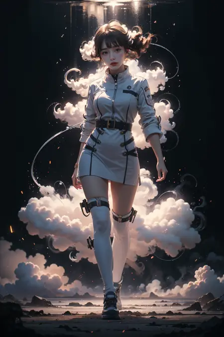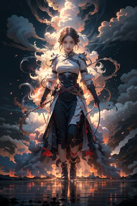 이 LoRA를 사용하여 인물을 묘사하면, 구름, 불, 하늘, 수면 등의 장식 요소를 인물과 화면에 추가할 수 있다;