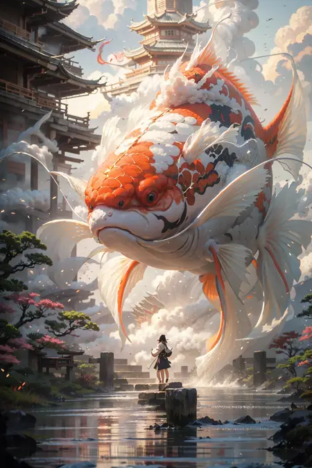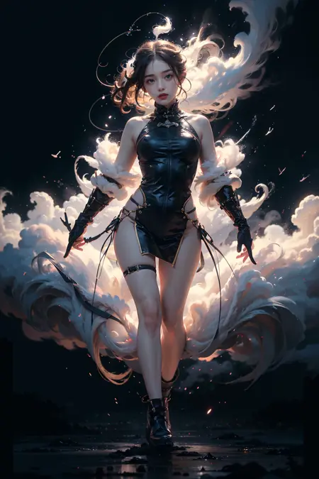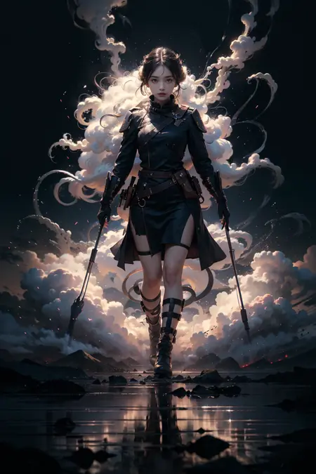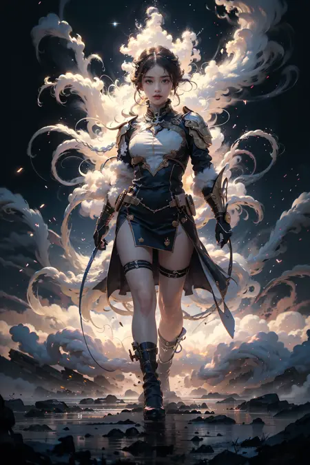 使用此LoRA描述人物时,可为人物和画面增添装饰元素,如:云、火、天空、水面等;