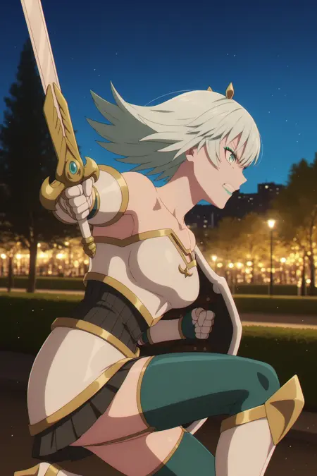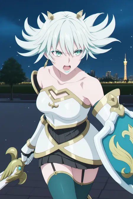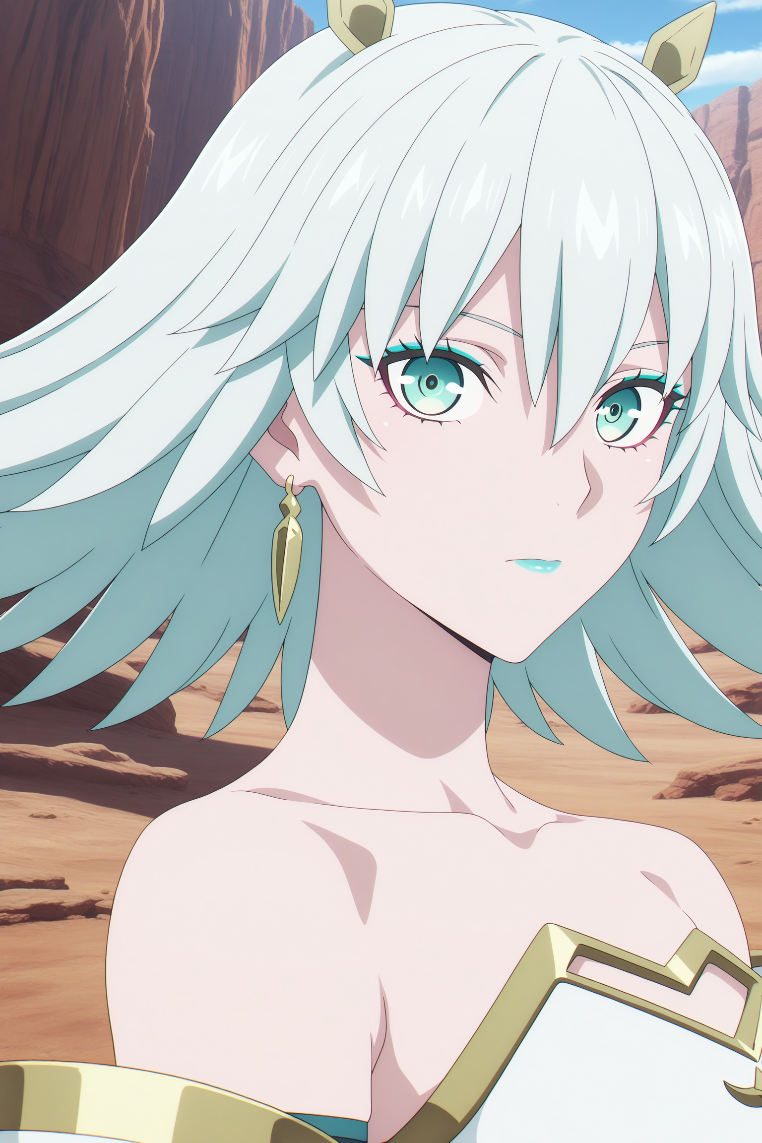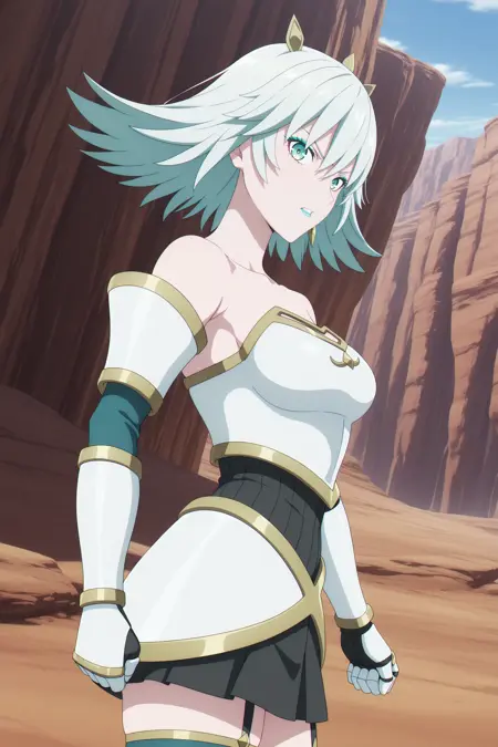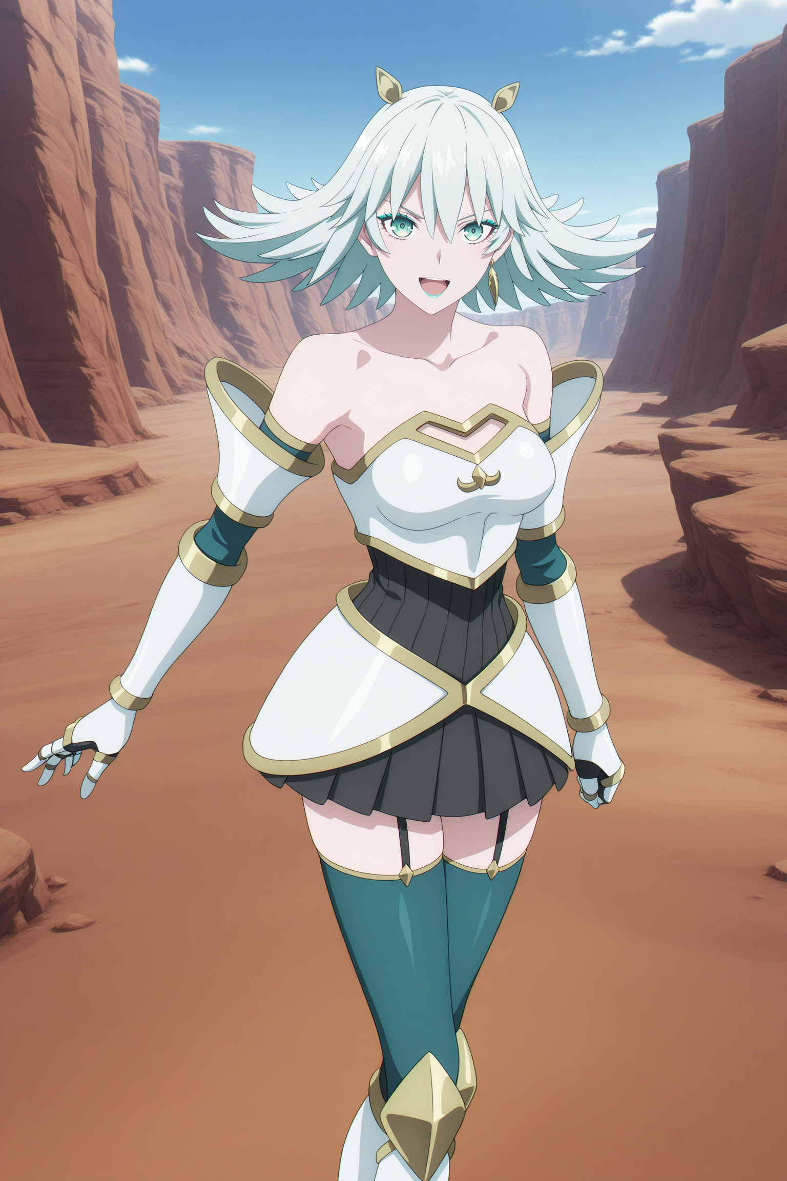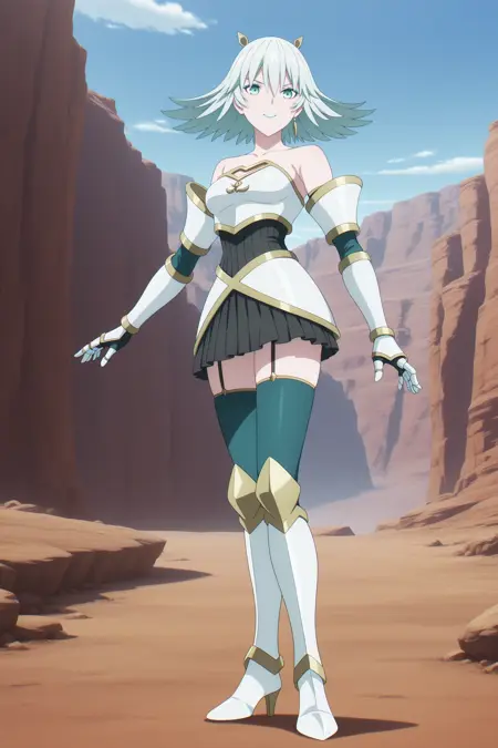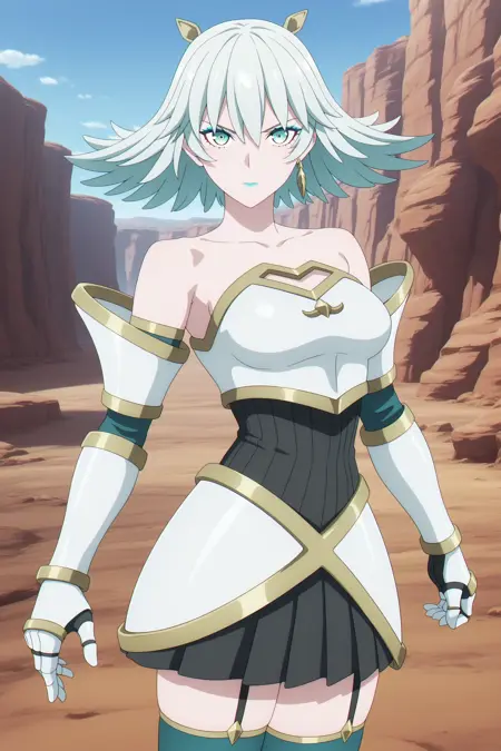 walkure, short hair, white hair, hair ornament, aqua eyeshadow, aqua eyes, aqua lips, single earring, feather earrings, armored dress, strapless dress, detached sleeves, arm guards, armored gloves, garter straps, aqua thighhighs, white footwear, knee boots, armored boots, high heel boots