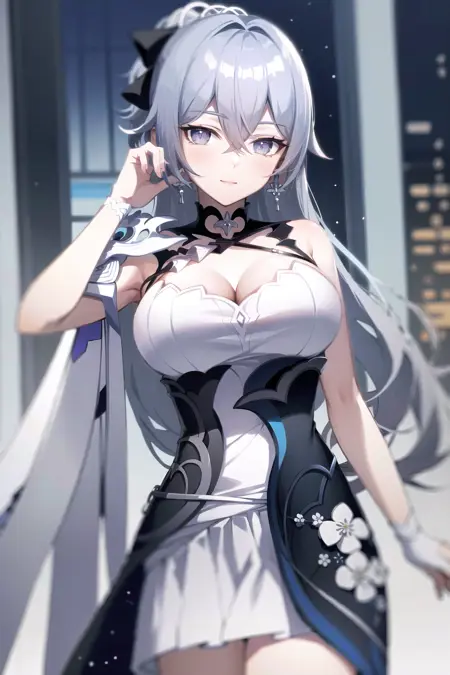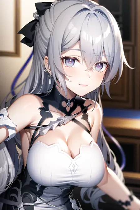 bronya zaychik, 红瞳, 乳房, 长发, 灰发, 眉发, 灰瞳, 耳坠, 钻头发, 双钻发髻, 发丝遮眼, 大乳房, 发饰, [请详细描述您希望触发的服装样式……]