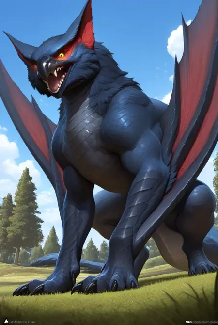 Nargacuga, 黄色の目白, 黒い毛皮, 鋭い歯, 犬歯, 爪, 翼, 翼のある腕, 尾, ふわふわした毛皮
