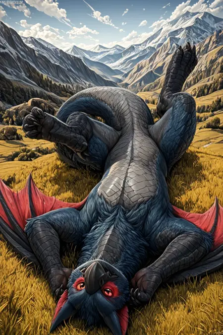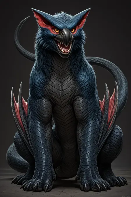 Nargacuga, yellow sclera, black fur, sharp teeth, fangs, claws, wings, winged arms, tail, fluffy fur