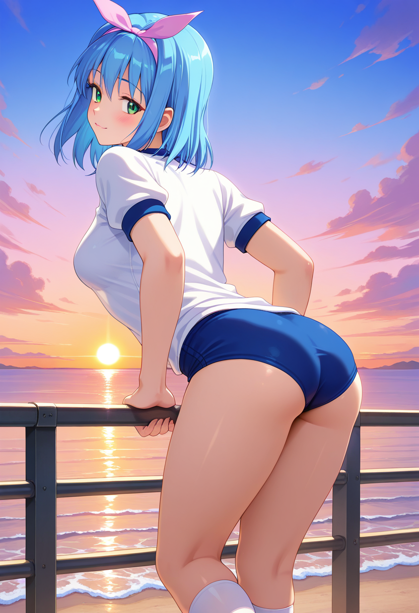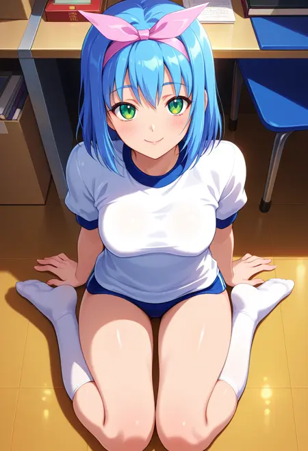 - gym uniform, gym shirt, untucked shirt, blue buruma, white socks,