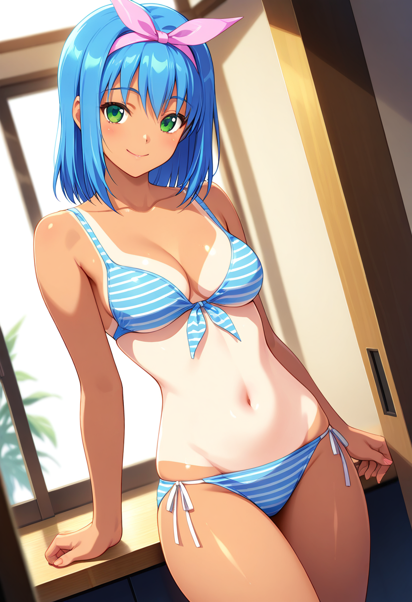 - breasts, cleavage, blue striped bikini, front-tie top, side-tie bikini bottom,