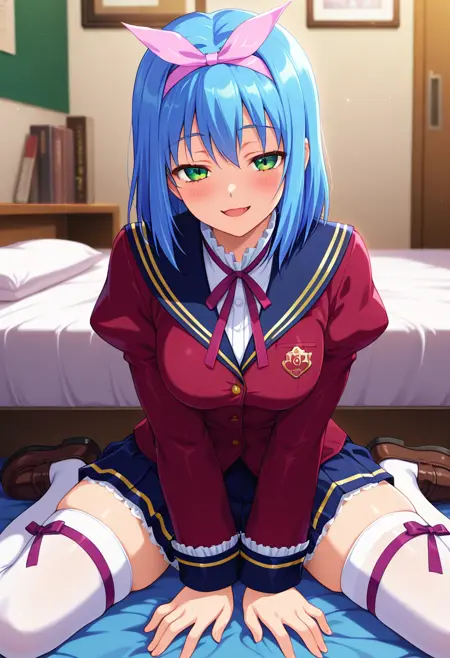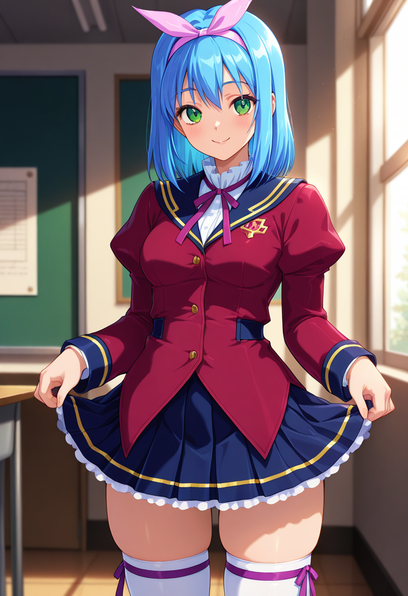- nagisaww, green eyes, blue hair, medium hair, pink hairband, pink hair bow, medium breasts,