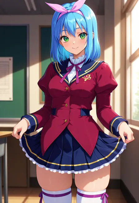 - school uniform, purple neck ribbon, red jacket, white dress shirt, puffy sleeves, juliet sleeves, dark blue pleated skirt, petticoat, zettai ryouiki, white thighhighs, purple thigh ribbon, loafers,