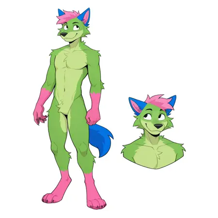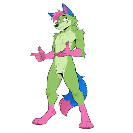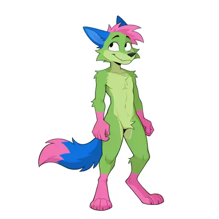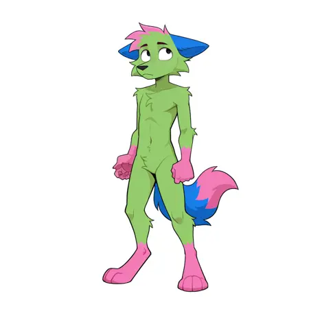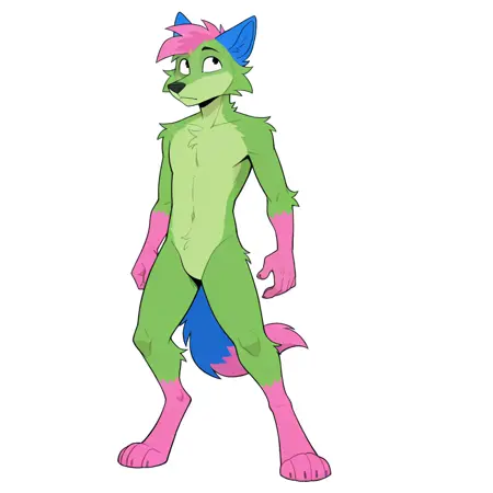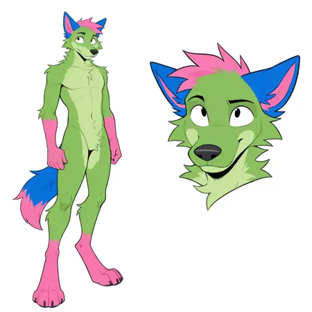 donttouchmypizza, kevin (nyanwolf), canine, green body, pink head tuft, blue ears, black eyes, pink hands, paws, pink feet, pink tail tip, blue tail