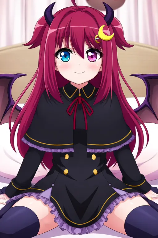 Trigger Word:Yuduki Roa, anime-style girl. The image features an anime-style character with vibrant red hair styled in two pigtails. The hair is adorned with a small crescent moon accessory on one side. The character has large, expressive eyes with one eye being blue and the other red, giving them a unique and striking appearance. The character has two small horns on top of their head, adding an element of fantasy or supernatural theme.The character's eyes are a striking shade of blue, which contrasts beautifully with their red hair. They have a cheerful expression, with a slight blush on their cheeks and a gentle smile.The character is dressed in a black outfit with ruffled details. The outfit includes a high-collared jacket with puffed sleeves and a layered skirt. The jacket has gold accents and a small bow at the waist. The skirt is also black with ruffles around the hem, adding a touch of elegance and femininity to the overall look.