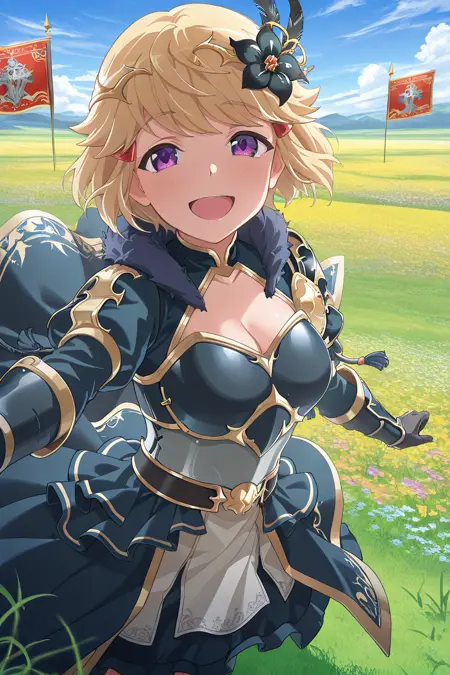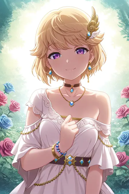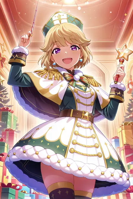 ryoko, 1girl, solo, gloves, purple eyes, fingerless gloves, epaulettes, looking at viewer, gold trim, smile, black gloves, bangs, short hair, aiguillette, skirt, thighhighs, closed mouth, blonde hair, light brown hair, white skirt, blush, sidelocks, stage outfit