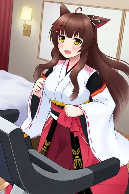 サンプルプロンプト: Fumi、アニメスタイルの少女。画像には、肩まで伸びる長い茶色の髪をもつアニメスタイルのキャラクターが描かれています。髪は緩やかなウェーブでスタイリングされ、自然で流れるような外観をしています。肌色に映える、大きくて表現豊かな金色の目を持っています。キャラクターは、白を基調とした伝統的な日本の着物を着ており、袖と襟に赤と黄の複雑な模様が施されています。着物の襟には蝶を模した装飾品が添えられ、outfitsに優雅さを加え、ゴールドの縁取りのある赤いスカートを合わせています。(彼女は踊っている:4.0)、(ちびネンドロイド:4.5)寝室で。