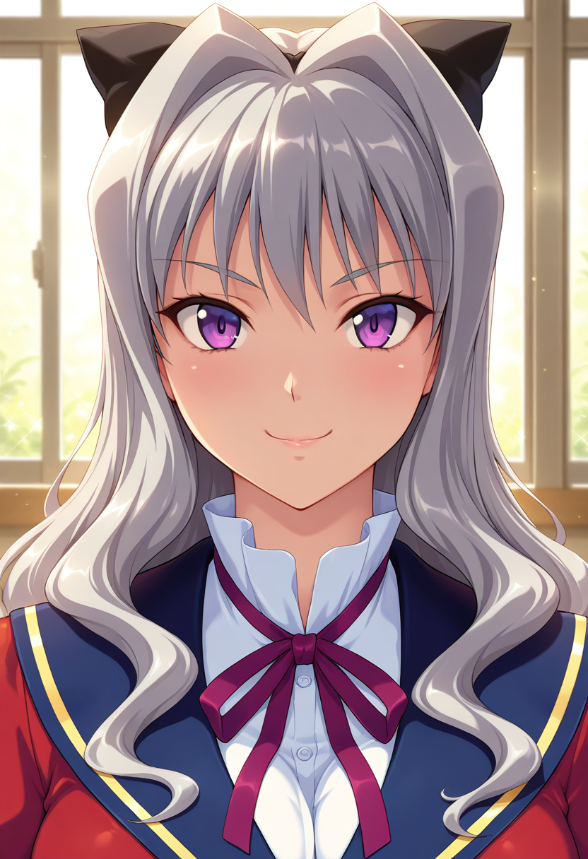 - 1girl, shoukoww, purple eyes, grey hair, long hair, wavy hair, hair intakes, black hair bow, large breasts,