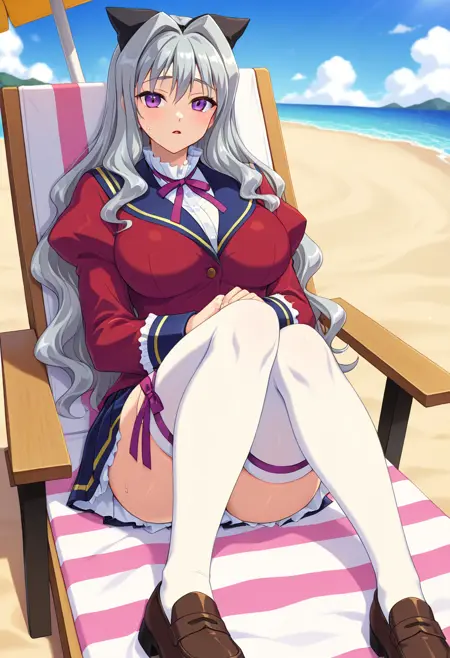 - school uniform, purple neck ribbon, red jacket, white dress shirt, puffy sleeves, juliet sleeves, dark blue pleated skirt, petticoat, zettai ryouiki, white thighhighs, purple thigh ribbon, loafers,