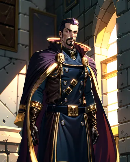 Trigger words: yasker, blue military coat, long purple cloak, high collar, golden edgings