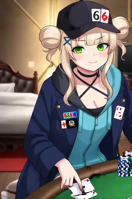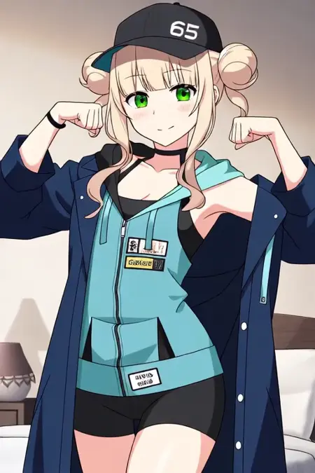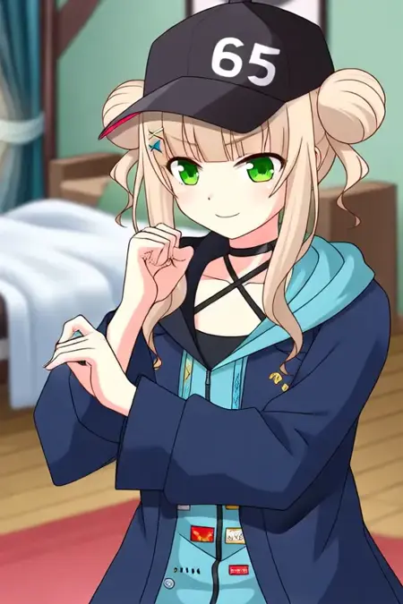트리거 단어: Kaburaki Roco, 애니메이션 스타일의 소녀. 이미지는 머리 양쪽에 두 개의 뾰족한 단발머리로 길게 묶인 밝은 금발의 애니메이션 스타일 캐릭터를 특징으로 합니다. 그녀는 녹색 눈을 가지고 있으며, 머리에 번호 "65"가 적힌 검은 모자를 쓰고 있습니다. 옷차림은 밝은 파란색 안감이 있는 진한 파란색 재킷으로, 다양한 패치와 단추가 있으며, 재킷 아래에는 얇은 스트랩이 달린 검은 상의와 반바지를 입고 있습니다.