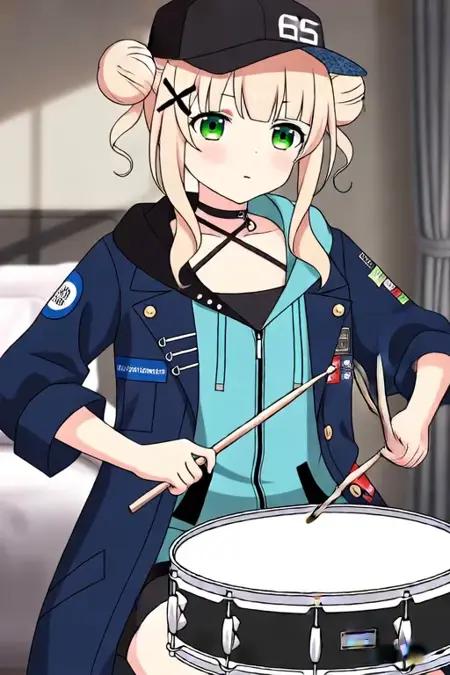 샘플 프롬프트: Kaburaki Roco, 애니메이션 스타일의 소녀. 이미지는 머리 양쪽에 두 개의 뾰족한 단발머리로 길게 묶인 밝은 금발의 애니메이션 스타일 캐릭터를 특징으로 합니다. 그녀는 녹색 눈을 가지고 있으며, 머리에 번호 "65"가 적힌 검은 모자를 쓰고 있습니다. 옷차림은 밝은 파란색 안감이 있는 진한 파란색 재킷으로, 다양한 패치와 단추가 있으며, 재킷 아래에는 얇은 스트랩이 달린 검은 상의와 반바지를 입고 있습니다. (그녀가 춤추고 있음:4.0), (치비 Nendoroid:4.5) 침실에서.