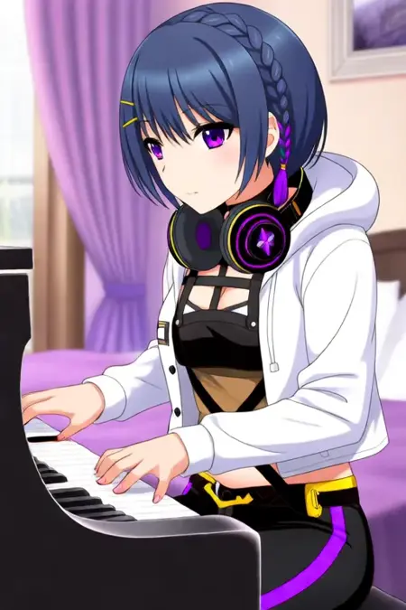 샘플 프롬프트: Koshimizu Toru, 애니메이션 스타일 소녀. 이미지는 두 줄로 땋은 짧은 어두운 청록색 머리카락을 가진 애니메이션 스타일 캐릭터를 특징으로 한다. 캐릭터는 보라색 눈을 가지고 있으며, 어깨에 검은색 스트랩이 달린 흰색 후디를 입고 있다. 후디 아래에는 하네스 형태의 검은색과 갈색 옷을 입고 있다. 캐릭터는 보라색과 검은색 디자인의 큰 오버이어 헤드폰을 착용하고 있으며, 이 헤드폰은 목에 걸려 있다. 캐릭터는 보라색과 노란색 액센트가 있는 검은색 바지를 입고 있다, (그녀는 춤추고 있다:2.5), (치비 Nendoroid:3.5) 침실에서.