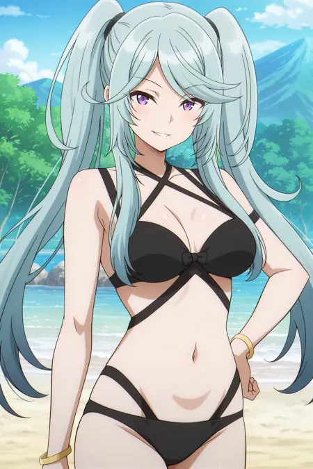 Epsilon, 1girl, solo, purple eyes, blue hair, long hair, twintails, swept bangs, sidelocks, medium breasts,
