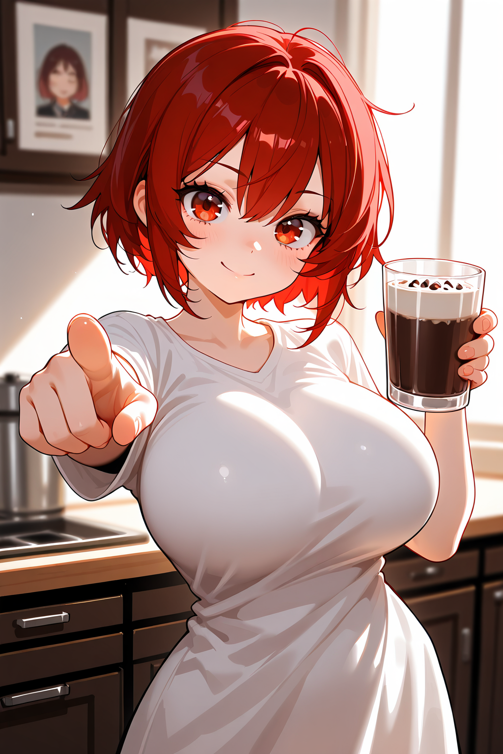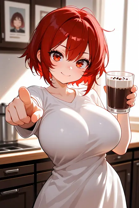 Useful tags: looking at viewer, holding cup, pointing at viewer, smile