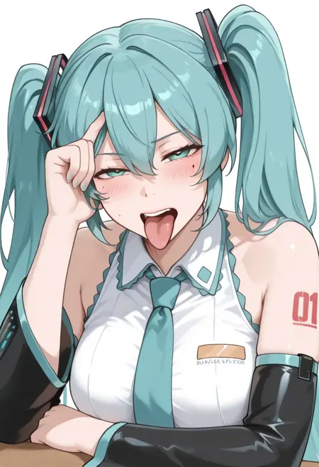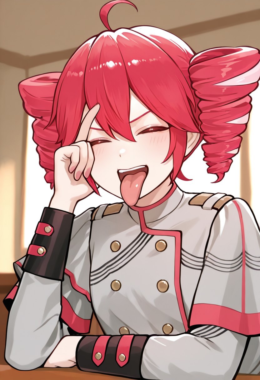 solo, 1girl, solo, blonde, long hair, orange eyes, t-shirt, aldn_frky_pose, hand on head, hand on table, table, tongue out, open mouth, smile, closed eyes, indoor, masterpiece, 4k resolution