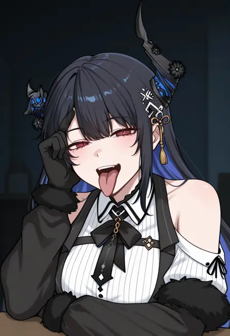 테이블 아래에 위치한 "벨트", "스커트", "긴양말", "신발" 등의 태그를 포함하면 모델이 정확하게 생성되지 않을 수 있습니다.