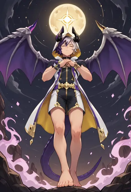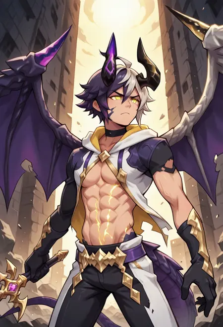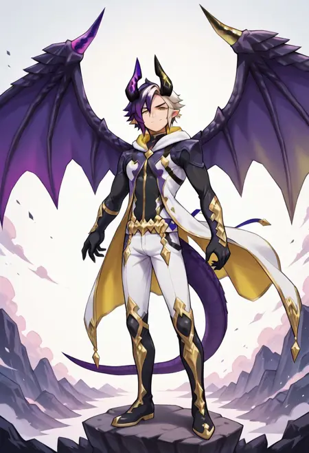 epimetheus, dragalia, lost, dragon, male, 1boy, male focus, full body, solo, dragon boy, demon boy, white hair, yellow eyes, pointy ears, slim body, gloves, hood, pants, boots, jewelry, dragon horns, purple and yellow horns, dragon wings, dual colors wings, tail, dragon tail