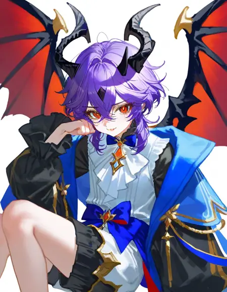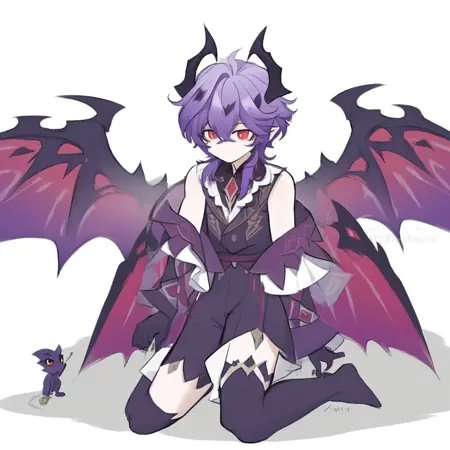Durin (genshin impact) purple hair, short hair with long locks, dark dragon horn, black dragon horn, hair between eyes, 1boy, 1solo, wings, red eyes