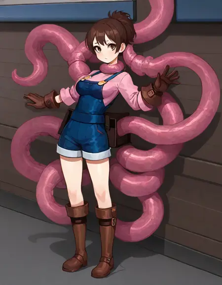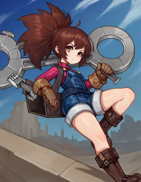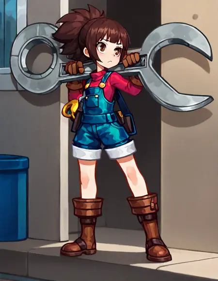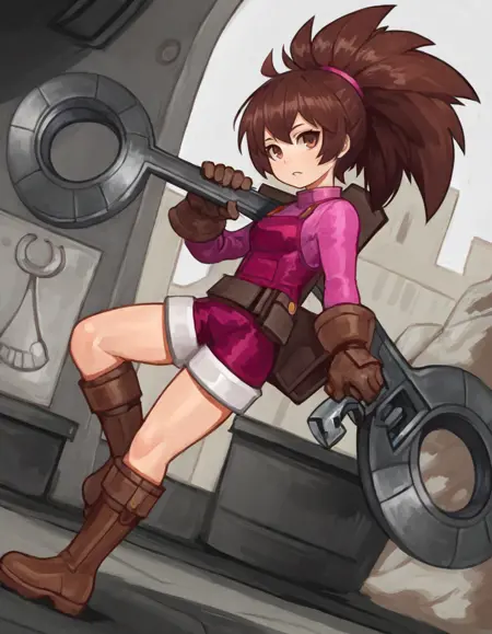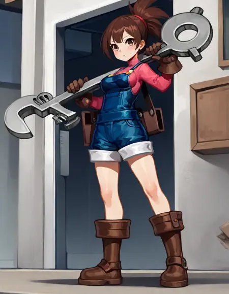 brown gloves, overalls, brown footwear, belt, hammer, giant wrench, knee boots, oversized object,shorts, brown_hair, ponytail, big_hair