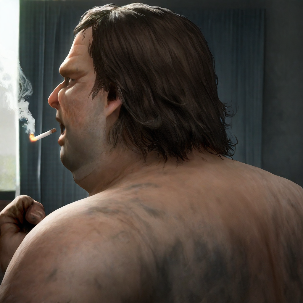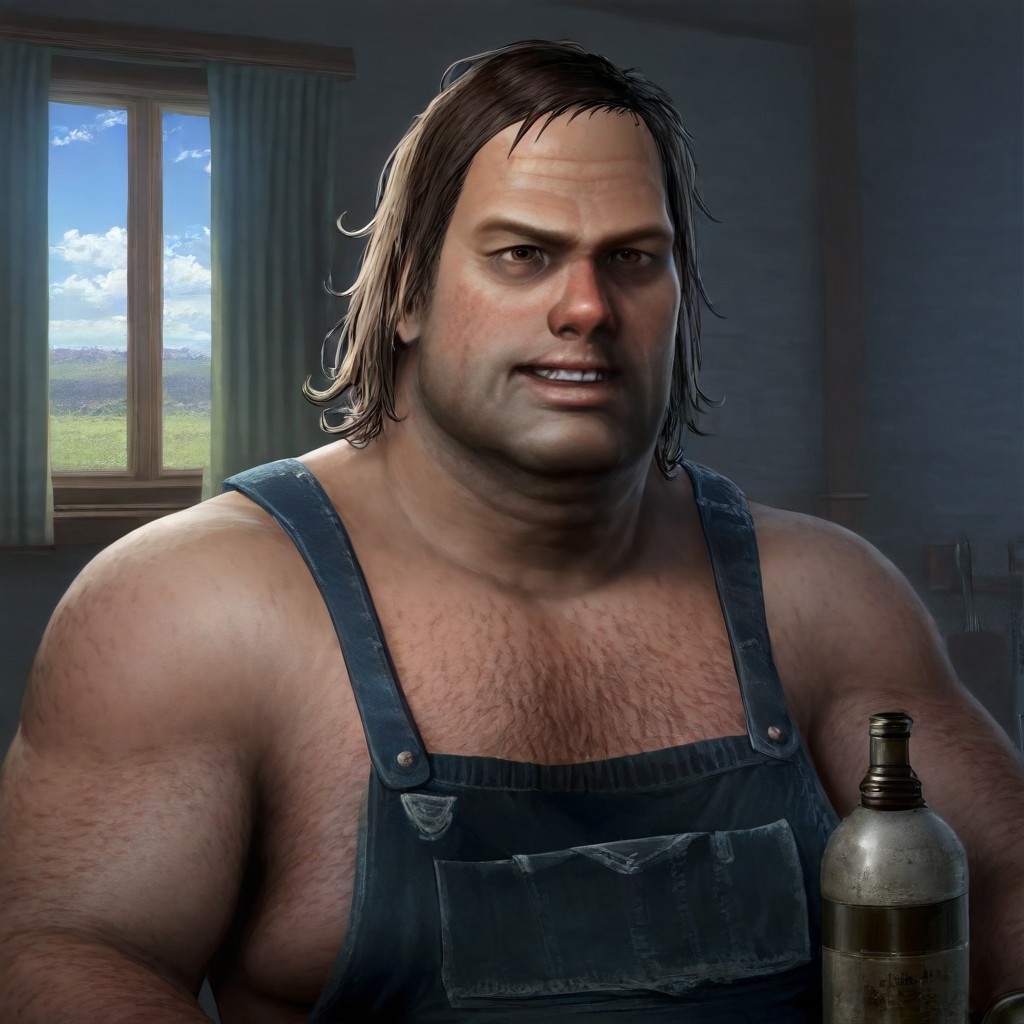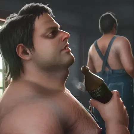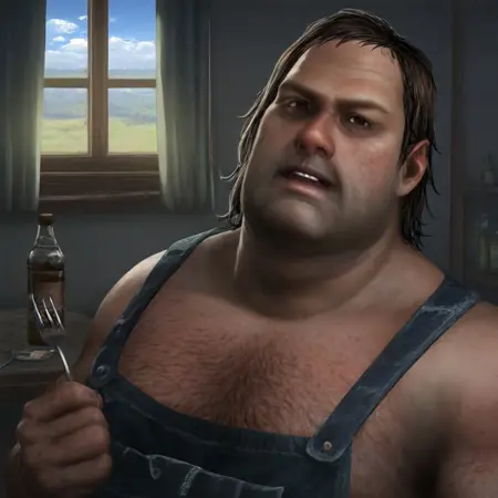 Bray Aberdeen, naked overalls, brown hair, arm hair, stubble, fat, chest hair, dirty, barefoot, denim overalls, short hair, brown eyes,