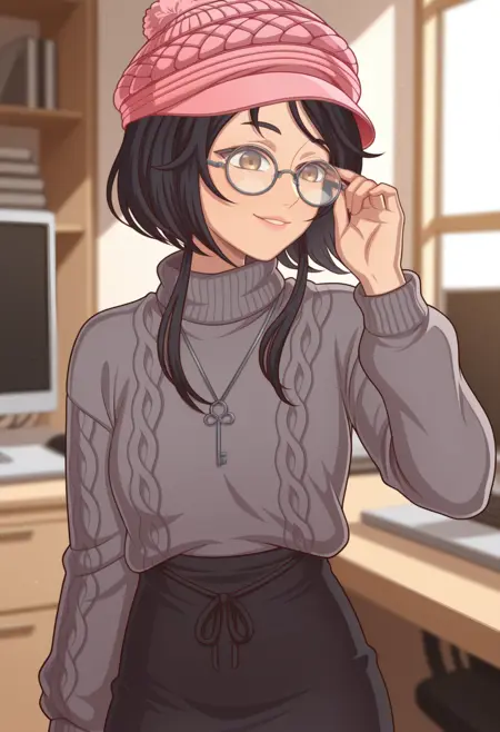 복장 - 터틀넥 스웨터, 회색 스웨터, 긴 소매, 검은 치마, 하이웨스트 치마