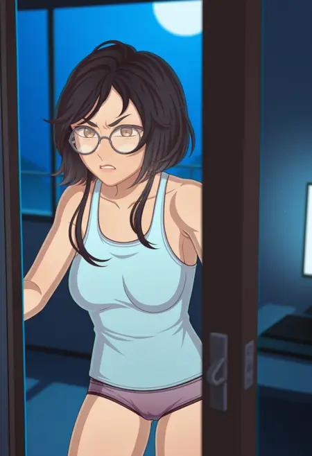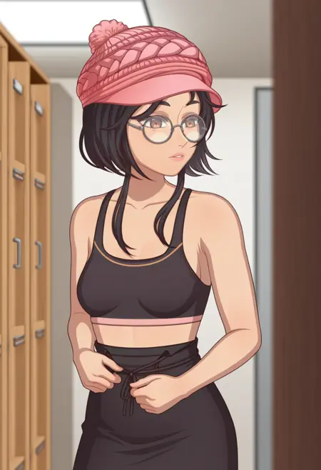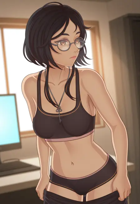 복장 - 갈색 셔츠, 긴 소매, 파란 텅탑, 검은 반바지, 데님 반바지