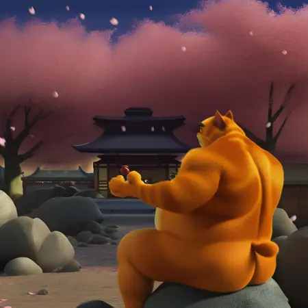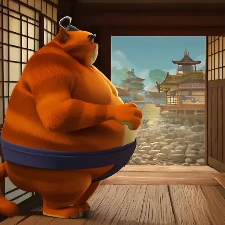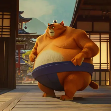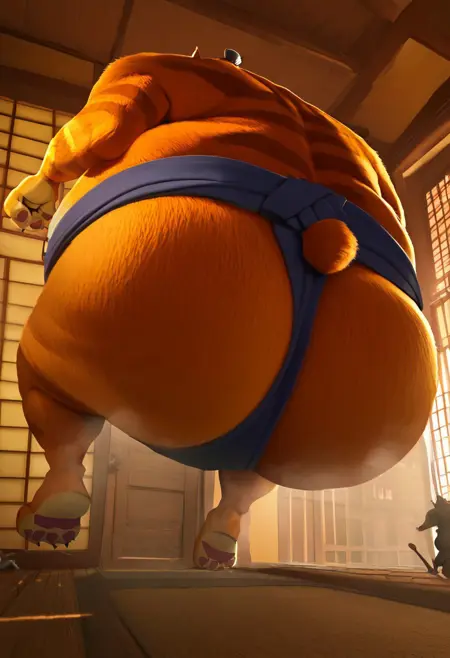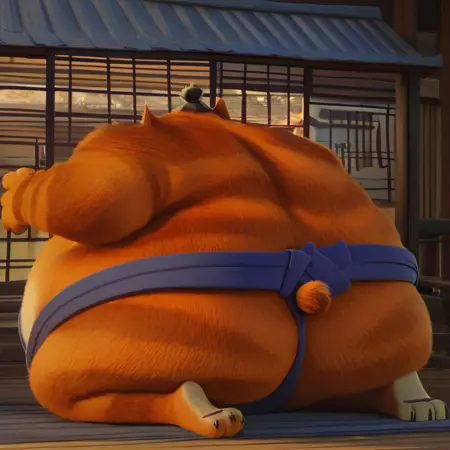 Sumo, cat, fat, whiskers, cat ears, dark blue sumo belt, furry, blue eyes, thick eyebrows, sharp teeth, colored sclera, pale yellow sclera, tiny pink nose, stubby tail, crop of black hair braided into a small bun, black unibrow
