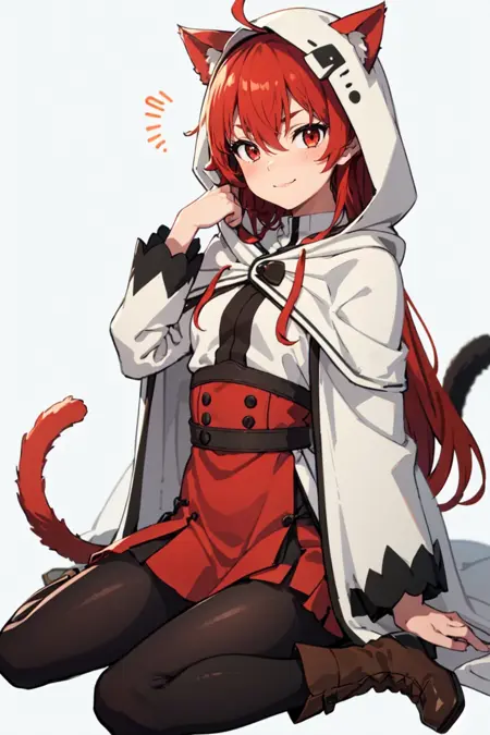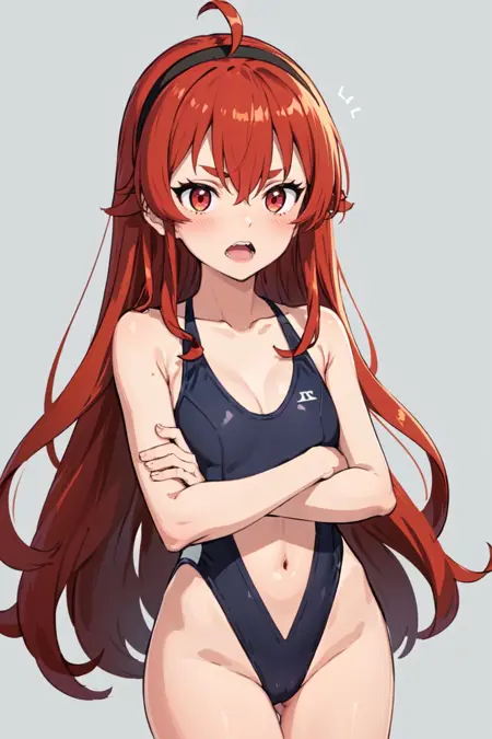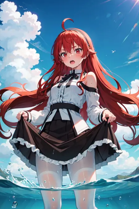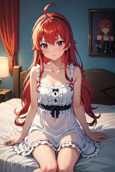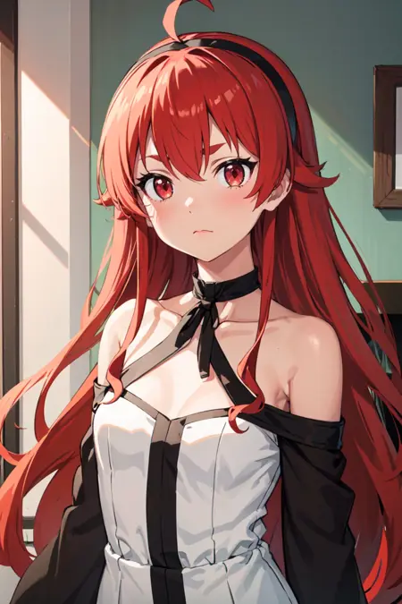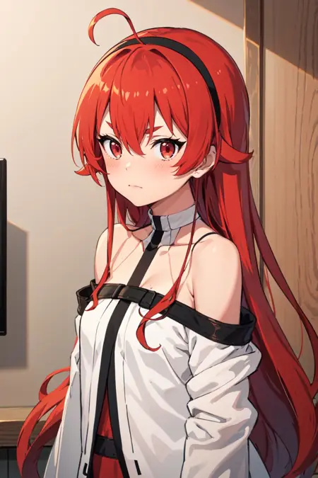 要还原她的原版服装,请使用以下标签:pikkyeris, 1girl, solo, looking at viewer, red hair, long hair, bangs, hair between eyes, ahoge, very long hair, red eyes, breasts, small breasts, hairband, black hairband, thick eyebrows, bare shoulders, long sleeves, skirt, shirt, white shirt, black skirt, blush